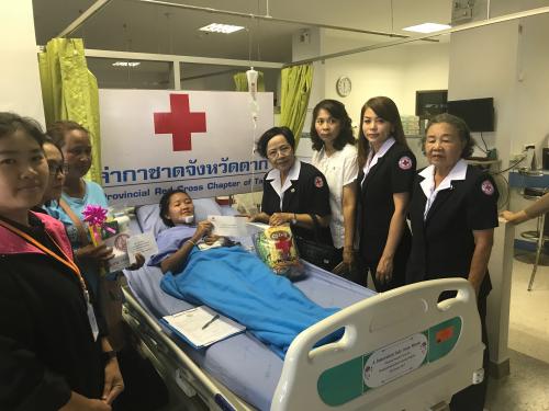 สถานีกาชาดเทพรัตน์ (สถานีกาชาดที่ ๑๓ จังหวัดตาก) เยี่ยมเด็กนักเรียนที่ได้รับบาดเจ็บจากอุบัติเหตุรถโดยสารบรรทุกนักเรียนพลิกคว่ำ จังหวัดตาก